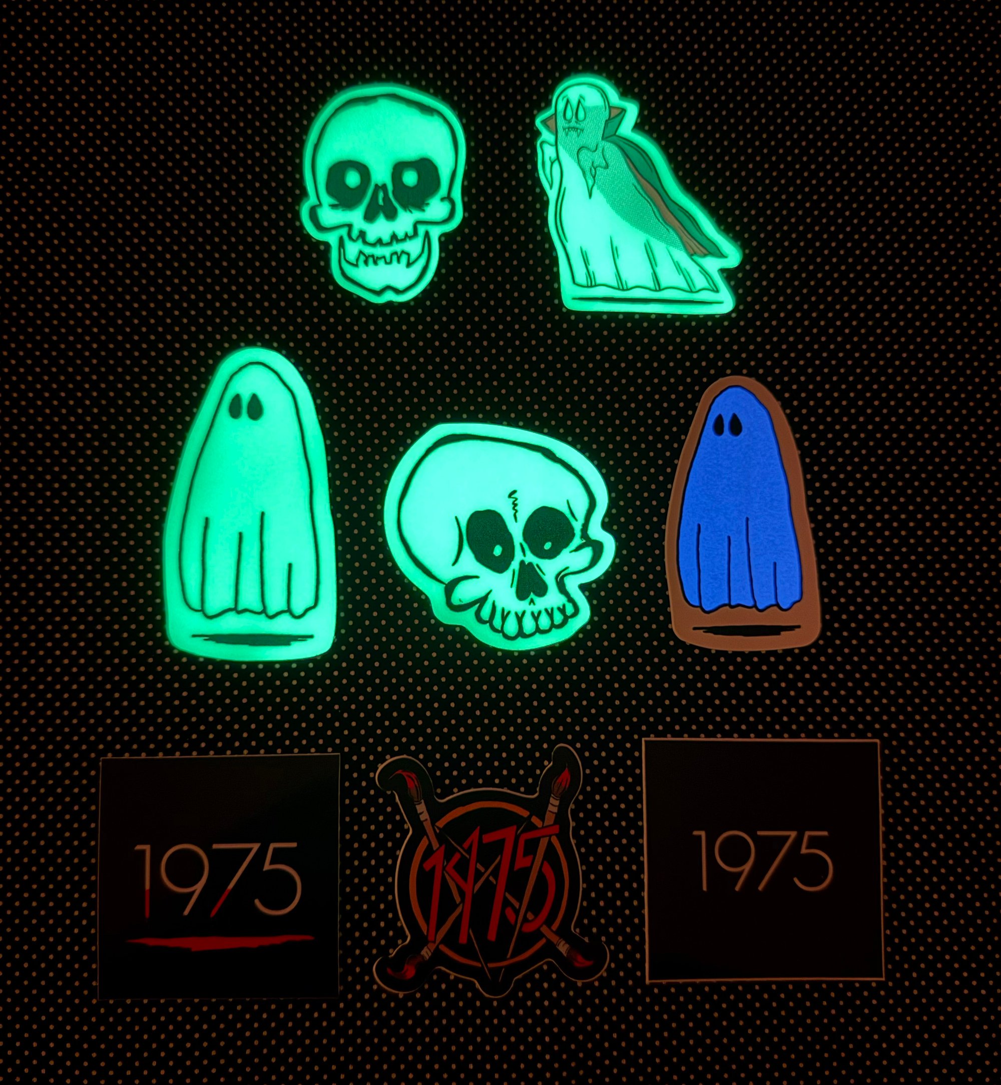 Includes 5 glow in the dark spooky stickers, the 17 year 1975 blood sticker, the 1975 Slayer sticker, and the classic 1975 logo. Sizes range from 2" - 3+"